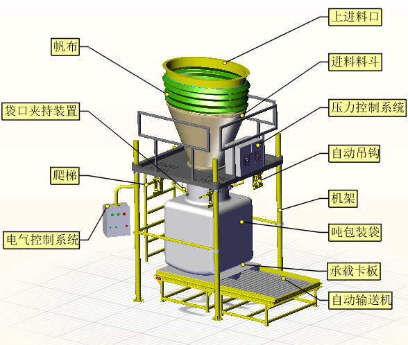 結(jié)構(gòu)圖 設(shè)備主要包含:進(jìn)料料斗、吊裝打包主機(jī)、雙工位自動輸送機(jī)、電氣控制系統(tǒng)、壓力控制系統(tǒng)。其中吊裝打包主機(jī)包含:支架、承載平臺、自動吊鉤、袋口夾持裝置、恒壓裝置、爬梯。